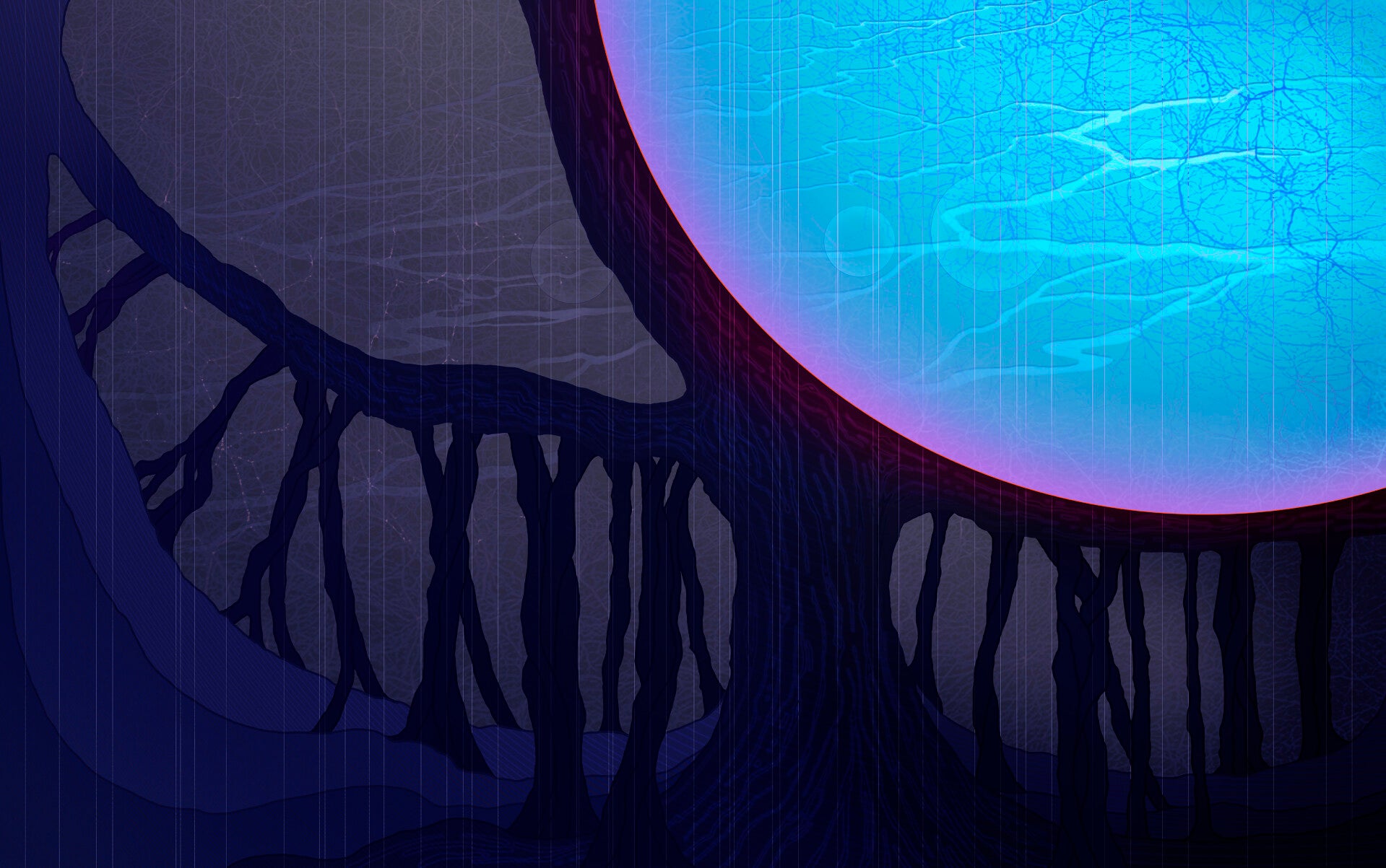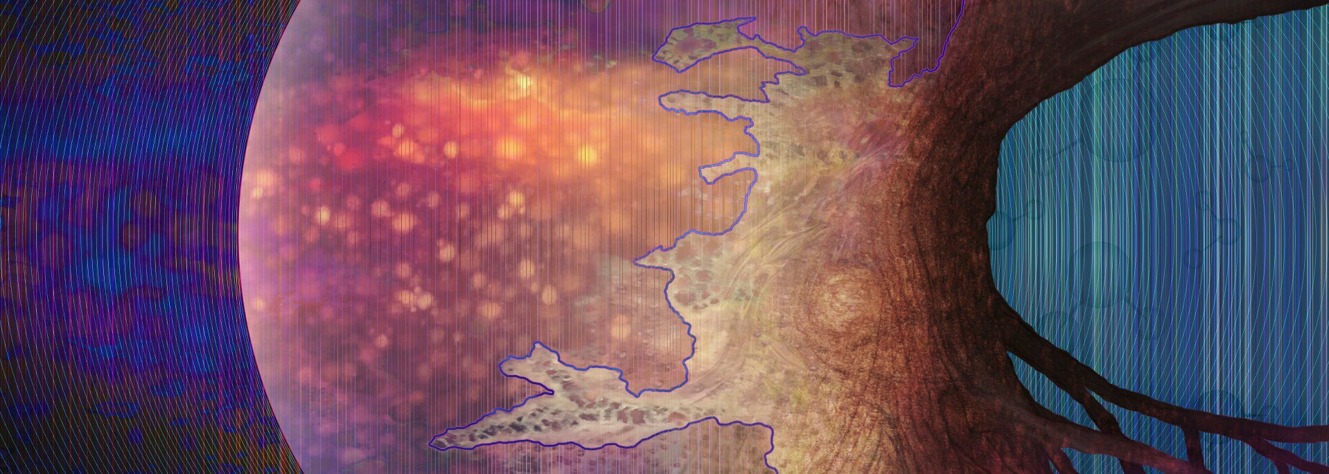 De achtergrond waarin deze rivier stroomt, verbeeldt het kosmisch web: een ver uitgezoomde voorstelling van onze kosmos. Het universum zit vol met enorme slierten materie die zich tussen sterrenstelsels uitstrekken als een groot web. Het is de driedimensionale, draderige structuur van intergalactisch gas en donkere materie. Op de knooppunten van deze draden, waar de dichtheid het hoogst is, bevinden zich de sterrenstelsels. Deze structuur van dit web lijkt op die van onze hersencellen. Zo boven, zo beneden.
